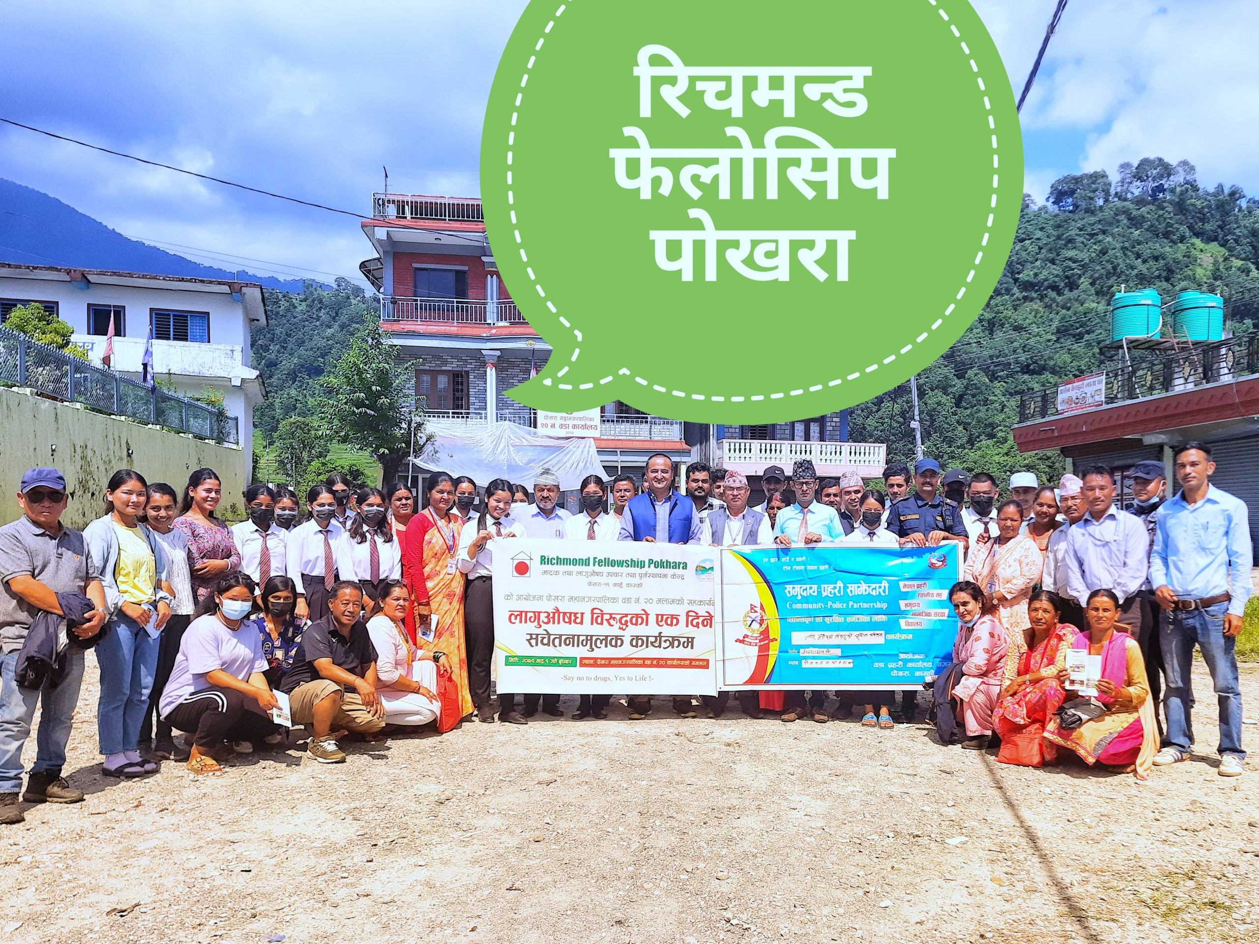 पोखरा महानगरपालिका वडा न.२० भलाम मा रिचमण्ड फलोसिप पोखरा लागु औषध उपचार तथा पुनःस्थापना केन्द्र पोखरा -११ काहु कास्की को आयोजना र पोखरा महानगरपालिका वडा २० तथा वडा प्रहरि कार्यालय बगरको सहकार्यमा लागु औषध विरुद्ध एकदिने सचेतना मुलक कार्यक्रम सम्पन्न गरेको छ।