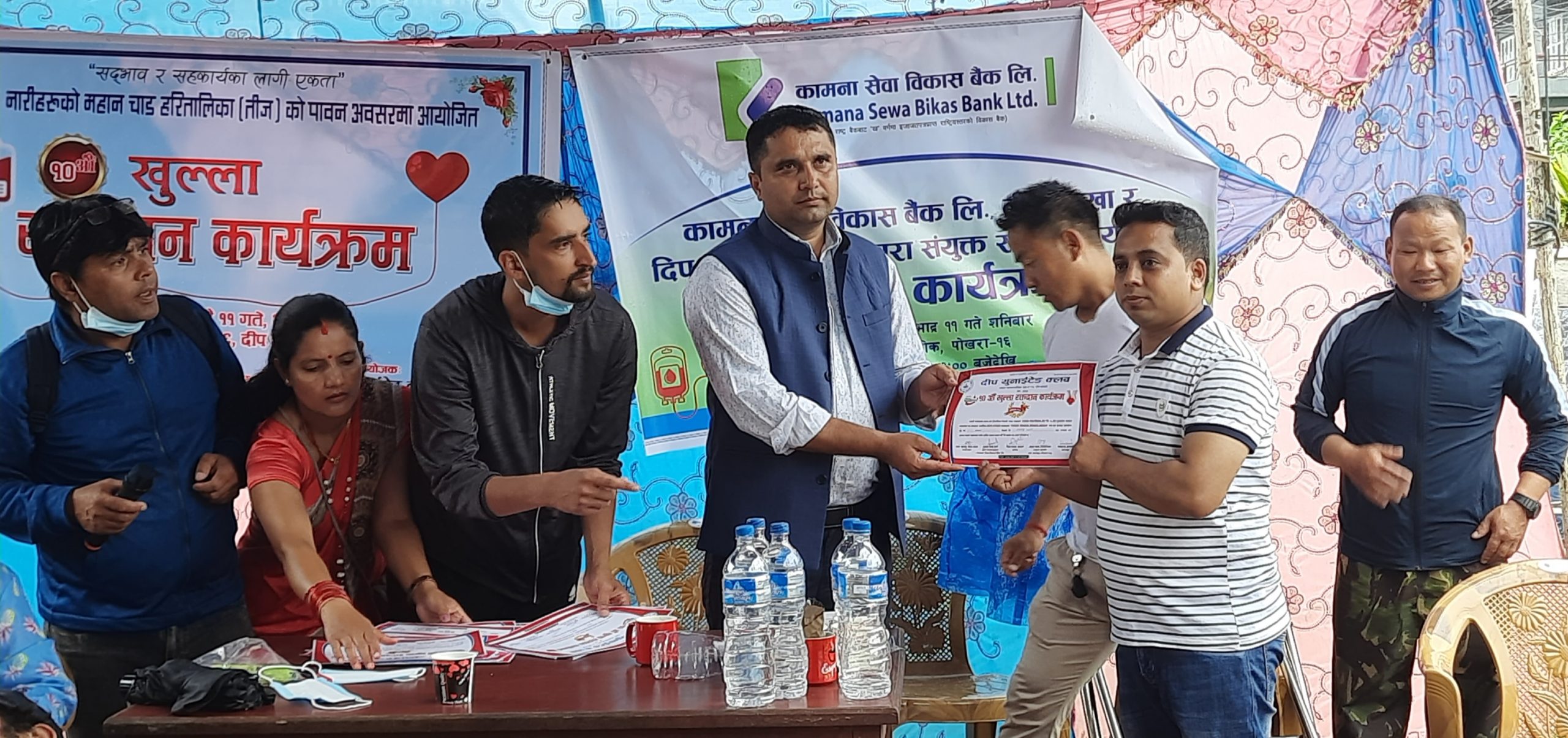 दिप युनाइटेड क्लवको आयोजना र कामना सेवा बिकास बैंक को सहआयोजनामा तथा मिडीया पार्टनर प्रमुख खबर.कमको सहकार्य मा “रक्त दान जीवन दान जिवन दान महादान” भन्ने नारालाइ बास्तबिकता मा बदल्दै स्थापना कालदेखि आजसम्म पनि यो कार्यक्रम लाइ निरन्तरता दिदै आएको आज को यश कार्यक्रम को अध्यक्षता सस्था का अध्यक्ष खेमराज आचार्य ले गर्नुभएको थियो भने प्रमुख अतिथि पोखरामहानगर पालिका का अध्यक्ष अमृत तिमिल्सिना ले गर्नु भएको थियो कार्यक्रम लाइ भब्य र सभ्य बनाउन को लागि सस्थाका सचिब भिम प्रसाद आचार्य ले सन्चालन गर्नुभएको थियो।