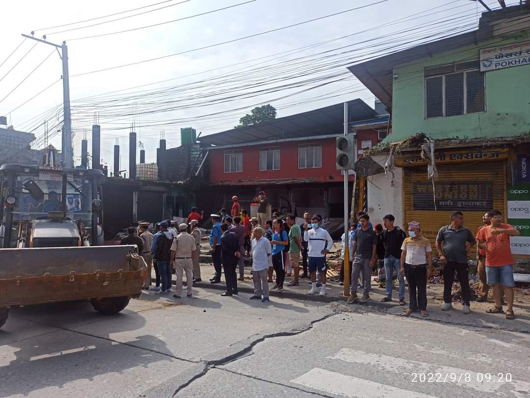एक बर्ष अगाडि नगर पालिको निणर्य लाइ टेक्दै प्रमुख धनराज आचार्य को टिम र पोखरा ९ का वडाध्यक्ष दीपेन्द्र मर्सानी सहितको टिमको उपस्थितिमा नगर प्रहरी को सहयोग लिएर बिहीबार महेन्द्रपुलको सार्वजनिक स्थानमा बनेको जिर्ण घर तथा सटर भत्काएको हो ।