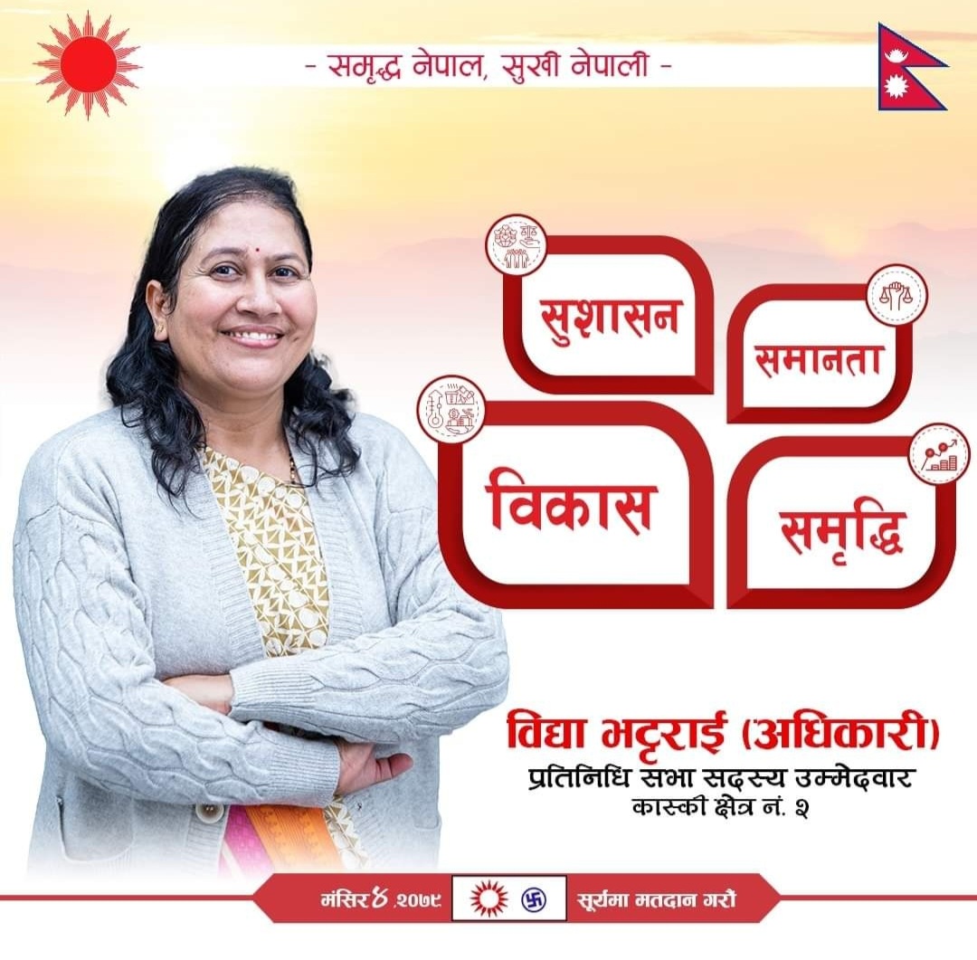 मंसीर ४ गते हुने प्रतिनिधि सभामा नेकपा एमाले कास्की निर्वाचन क्षेत्र नं. २ का प्रतिनिधि सभा सदस्यका उम्मेदवार विद्या भट्टराई अधिकारीले जनताले अधिकार दिएमा आफुले पुरै कर्तव्य पुरा गर्ने बताउनु भयो सो बिसय निर्वाचनको क्रममा घरदैलो कार्यक्रममा उहाले जनताको भोटको कदर गरी आवश्यक नीति निर्माणसंगै आफ्नो क्षेत्रको विकासमा इमान्दर पूर्वक लाग्ने प्रतिवद्धता गर्नु भयो ।