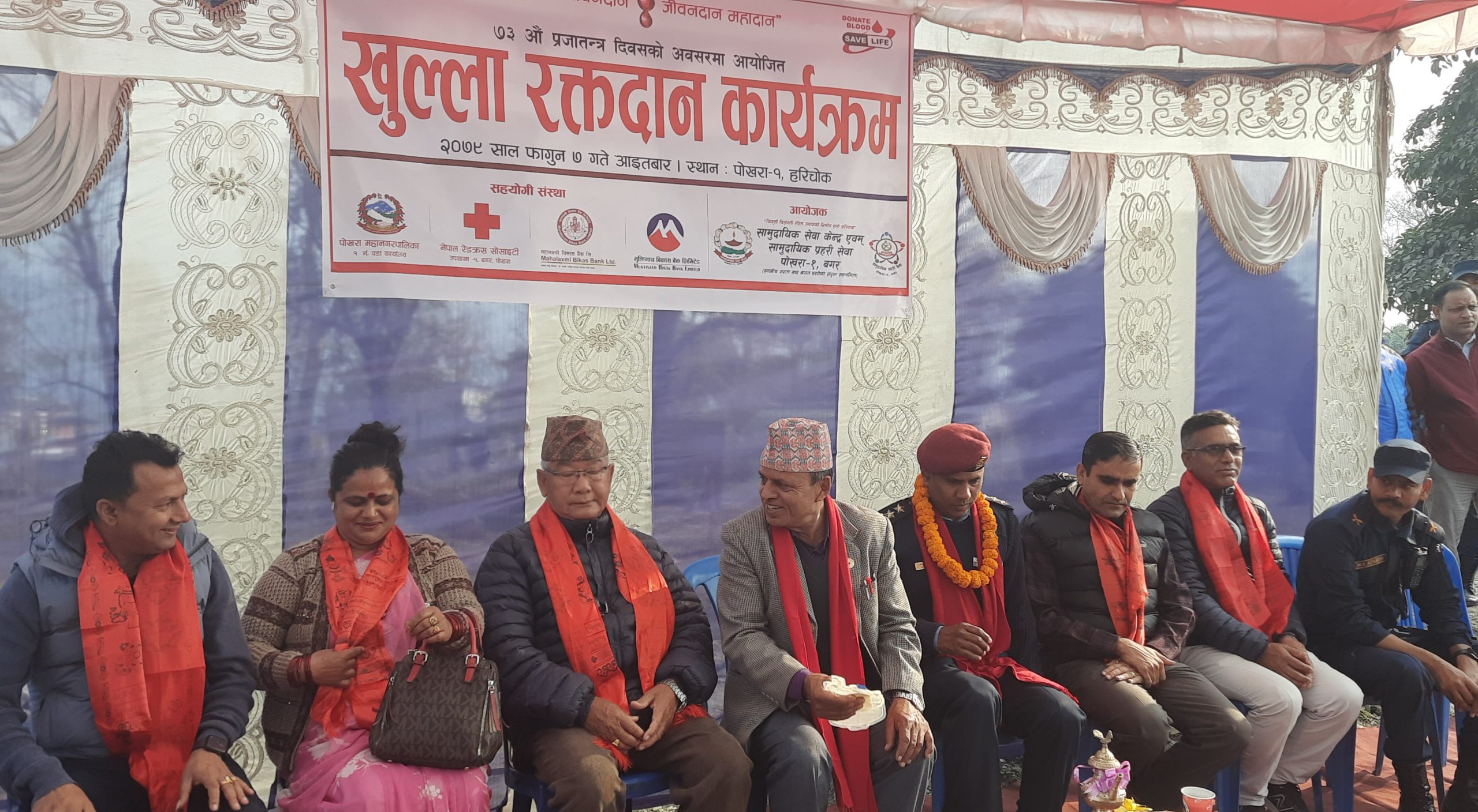 सामुदायिक सेवा केन्द्र एवम सामुदायिक प्रहरी सेवा पेाखरा १ टुडिखेल बगरको आयेाजनामा ७३औ प्रजातन्त्र दिवसको उपलक्ष्य मा आयोजित सस्था को २० औ खुल्ला रक्तदान कार्यत्रममा ५२ जनाले रक्तदान गर्नु भयो ।