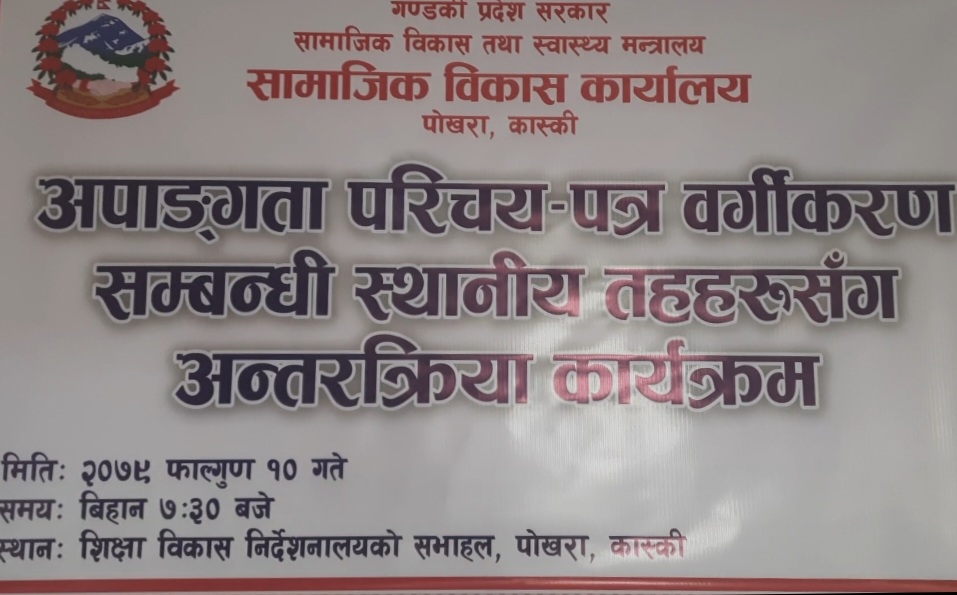 एक दिने कार्यक्रम सञ्चालन गरेको सामाजिक विकास तथा स्वास्थ्य मन्त्रालयको सामाजिक विकास कार्यालय पोखरा कास्कीले स्थानीय तहका जनप्रतिनिधि उपप्रमुखहरु र अपाङ्गता हुनुभएका ब्यक्ति हरुको बिचमा सामाजिक विकाससँग काम गर्ने कार्यालयका जिम्मेवार कर्मचारीहरु र समाजमा भएका अपाङ्गता व्यक्तिहरूको के कसरी वर्गीकरण गरिएको छ,अपाङ्गता का प्रकार,अपाङ्गता बाट प्राप्त फरक किसिमका कार्डबाट के सुबिधा पाइन्छ भन्ने बिषयमा रहेर अधिकारका विषयहरु सहित उठान गर्नुपर्ने साथै थप्नुपर्ने सबै बिषयमा रहेर घनिभूत छलफल गर्नका लागि भएको एकदिवसीय कार्यक्रममा करिब १०० जनाको उपस्थितिमा सम्पन्न भएको थियो।