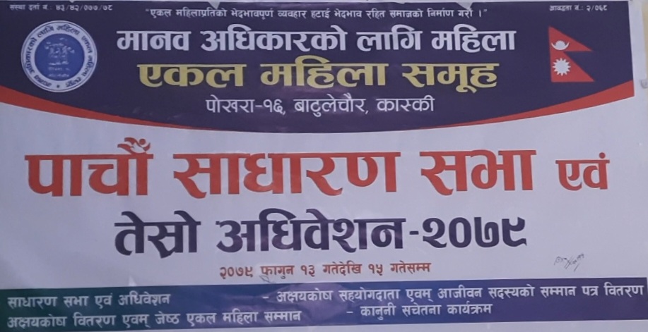 एकल महिला प्रतिको भेदभाव पुर्ण ब्यवहार हटाइ भेदभाव रहित समाजको निर्माण गरौं भन्ने भावनाका साथ मानव अधिकारको लागि महिला एकल महिला समूह पोखरा-१६, बाटुलेचौर कास्कीको पाँचौं साधारण सभा एवं तेस्रो अधिवेशन बाट फेरि पनि दुर्गा थापा सर्वसम्मत रुपमा अध्यक्ष चयन हुनुभएको छ।