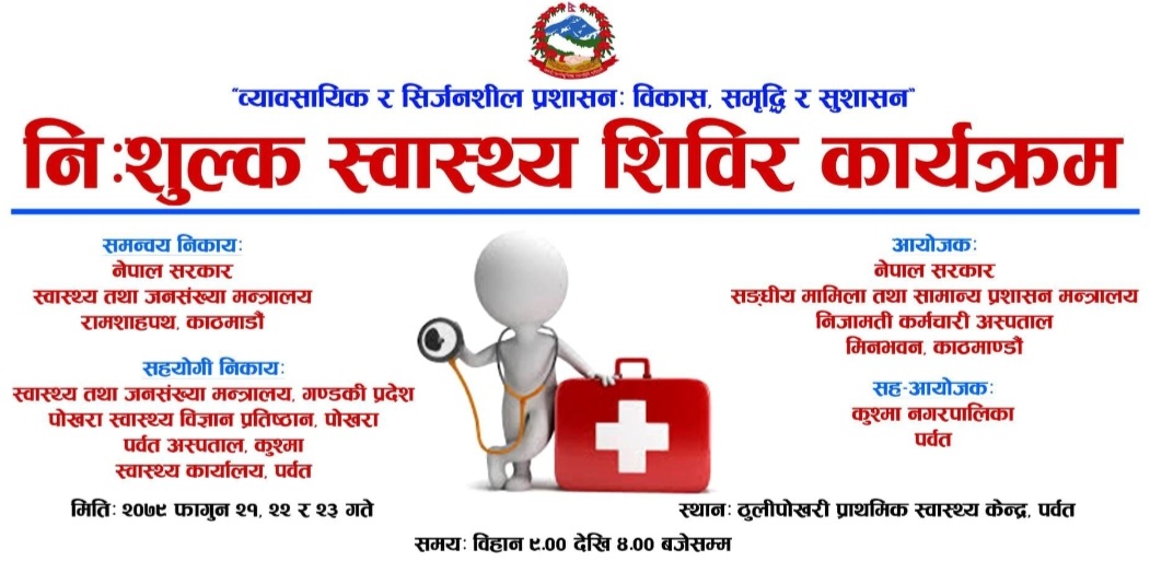 निजामती सेवा दिवसको अवसर पारेर निजामती कर्मचारी अस्पताल काठमाण्डौको आयोजना तथा कुश्मा नगरपालिकाको सहआयोजनामा ठुलीपोखरी प्राथमिक स्वास्थ्य केन्द्रमा संचालन हुने शिविरको सवैजसो तयारी पुरा भएको वडा नं. १२ का वडा अध्यक्ष झलक रिमालले जानकारी दिनुभयो । शिविर संचालनका लागि स्वास्थ्य तथा जनसंख्या मन्त्रयालयसँगको समन्वय र स्वास्थ्य तथा जनसंख्या मन्त्रालय गण्डकी प्रदेश, पर्वत अस्पताल र स्वास्थ्य कार्यालयको सहयोग रहेको छ । फागुन २१, २२ र २३ गते गरी तीन दिन सम्म संचालन हुने शिविरको व्यवस्थापनको कार्य सम्पन्न भएको वडा अध्यक्ष रिमालले जानकारी दिनुभयो ।