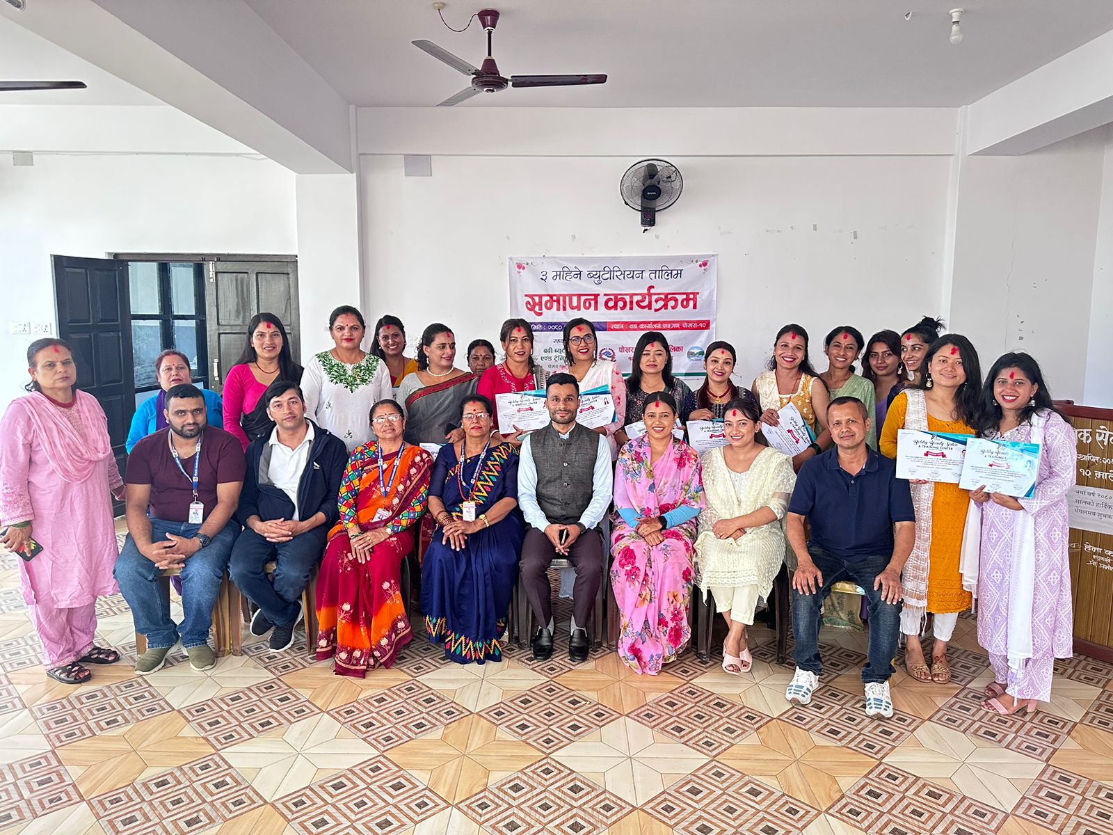 पोखराको बुद्धचोकमा रहेको ववि ब्युटि सलोन एण्ड टेनिङ सेन्टरको प्राविधिक सहयोगमा वडा भित्र रहेका महिलाहरुलाई लक्षित गरी आयोजना गरिएको उक्त तालिमको समापन गर्दै पोखरा महानगरपालिका वडा नम्बर १२ का वडा अध्यक्ष सन्तोष बास्तोलाले आगामी दिनमा युवालाई लक्षितगरी विभिन्न सीपमुलक ब्यवशायीक तालिम दिने वताउनु भयो । सो अवसरमा वोल्दै तालिमका संयोजक शान्ती कोइरालाले पोखरा १२ भित्र रहेका महिला दिदी वहिनीहरुलाई लक्षित गरी तीन महिने ब्युटिशियन तालिमको आयोजना गरेको बताउनु भएको थियो ।