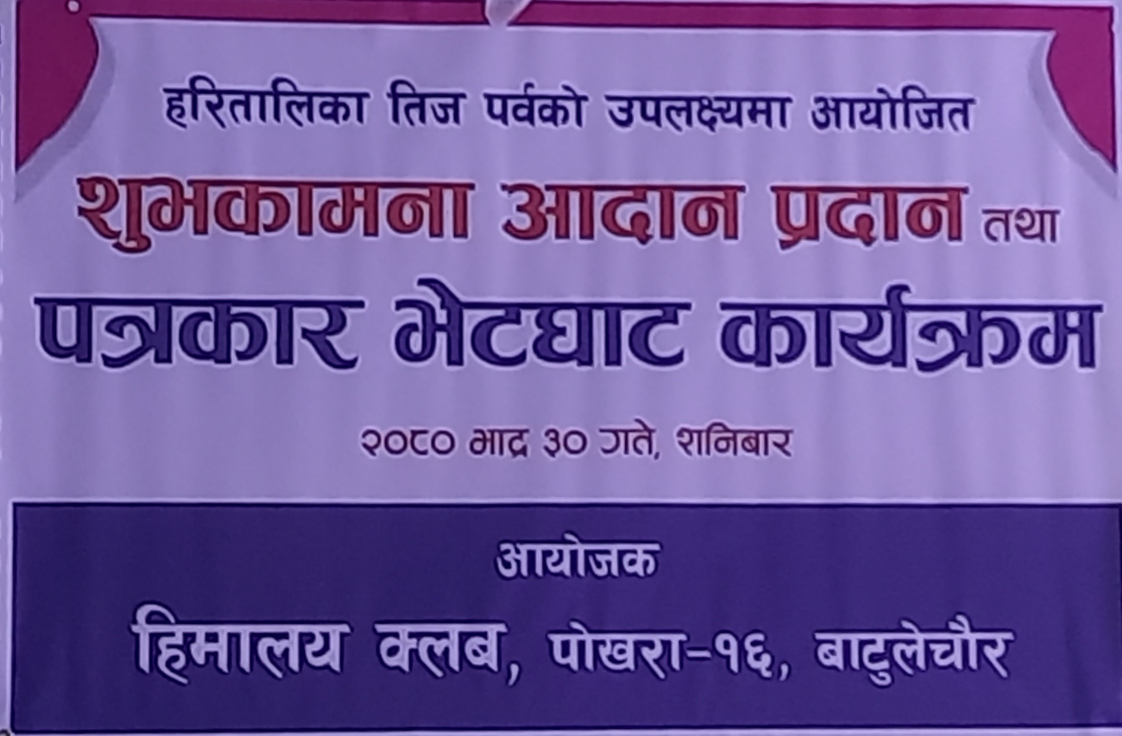 नेपाली महिलाको महान पर्व हरितालिका तीजको अवसरमा यही असोज १ गते हिमालय क्लवको आयोजनामा स्थानिय खेल मैदानमा हुन लागेको मेलाको जानकारी दिन पोखराको कालिका को हलमा पत्रकार सम्मेलन गरी संस्कृति प्रधान कार्यक्रमलाई प्रोत्साहन सहित संस्कृतिको जर्गेना तथा मेलाको निरन्तरताको लागी गर्न लागिएको सस्थाको सचिव शिब राज देवकोटा ले वताउँनुभयो ।