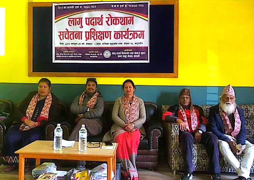 लागु औषध रोकथाम सचेतना प्रशिक्षण कार्यक्रम समुहका अध्यक्ष कल्पना आचार्य बास्तोलाको अध्यक्षतामा भएको कार्यक्रमको प्रमुख अतिथि पोखरा महानगरपालिका वडा नं. १६ का वडा सदस्य रामचन्द्र आचार्य हुनुहुन्थ्यो भने कार्यक्रम लाइ भब्य र सभ्य रुपले सन्चालन सस्थाका सचिव विद्या पौडेल अधिकारीले गर्नुभएको थियो ।