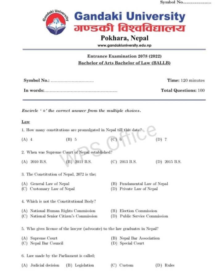 गण्डकी विश्वविद्यालयको कु कार्य प्रश्नपत्रनै मापदण्ड विपरित  ः