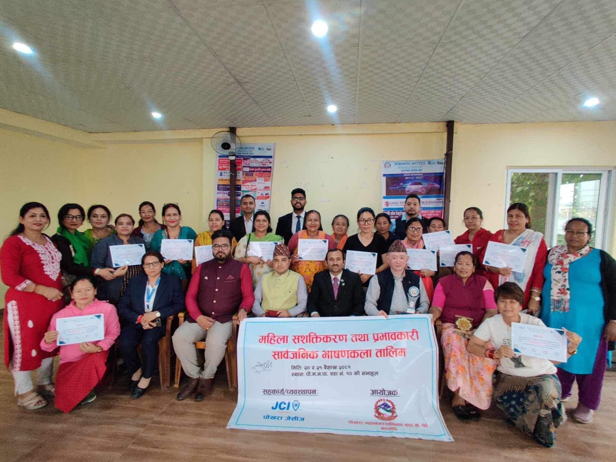 पोखरा जेसीजको महत्वपुर्ण कार्यक्रम जेसीज सप्ताह २०२४ को दोस्रो दिनलो महिला सशक्तिकरण तथा प्रभावकारी सार्वजनिक भाषणकला तालिम पोखरा महानगरपालिका वडा न.१० कार्यलयमा समापन भयो ।