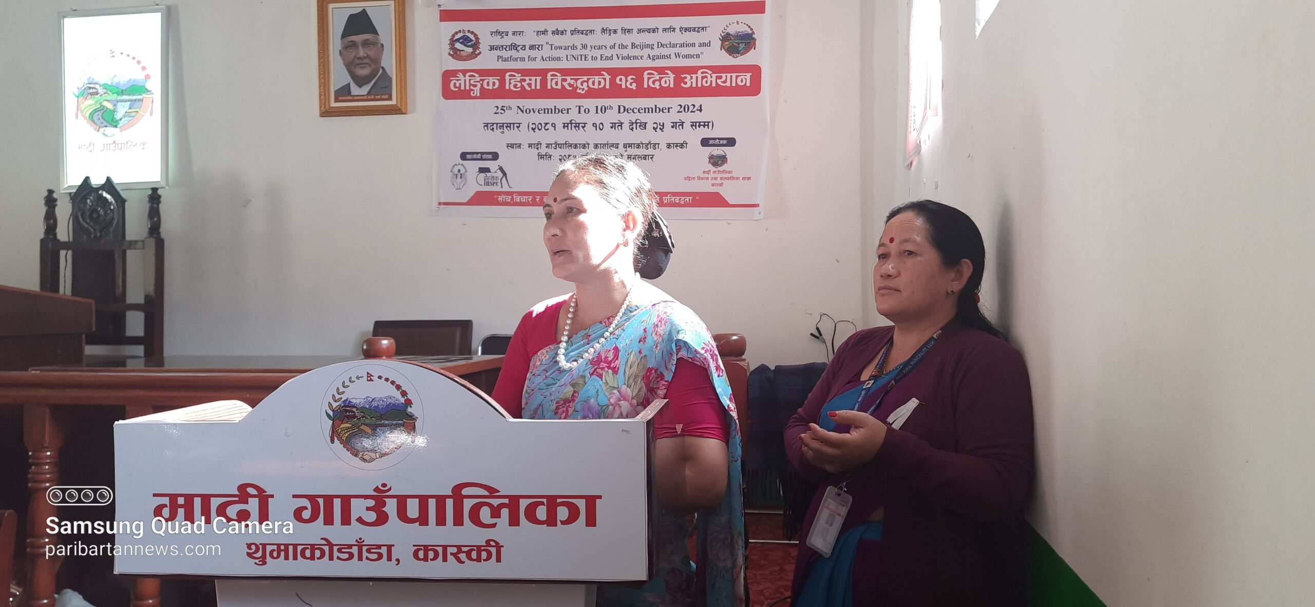 मादी गाउँपालिकाले १६ दिने लैङ्गिक हिंसा विरुद्ध अभियान कार्यक्रम पालिकाको सभाहलमा मंसिर १० बाट २५ गते सम्म पालिकाको सबै वडाहरुमा सुरु गरेको छ।