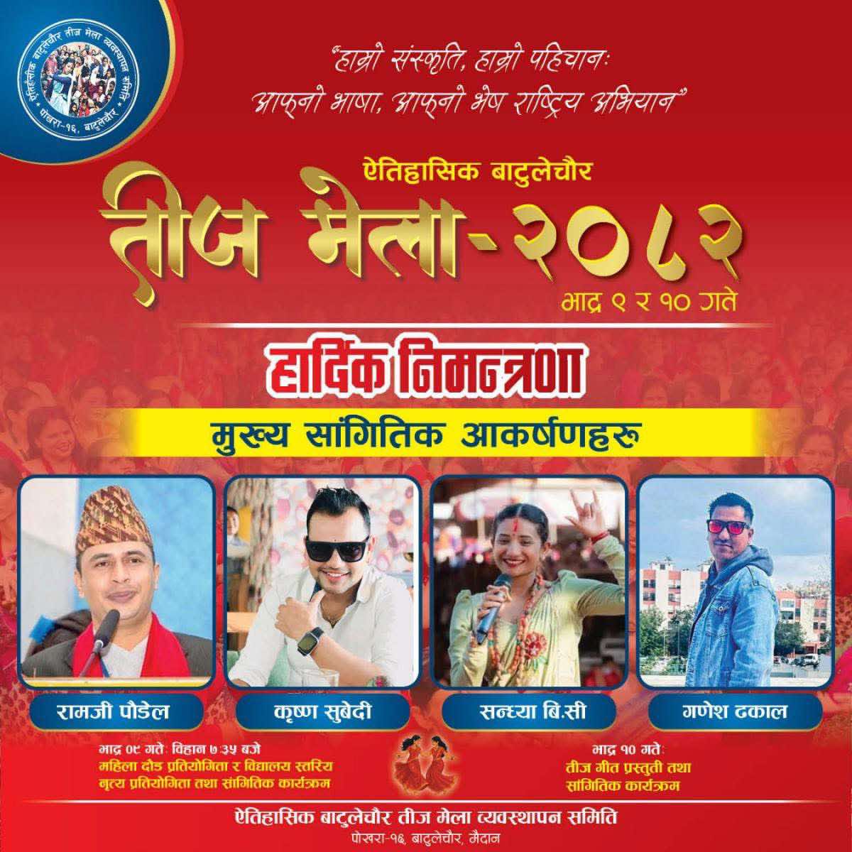 यही भदौ ९ र १० गते स्थानीय बाटुलेचौर खेल मैदानमा हुने ऐतिहासिक बाटुलेचौर तीज मेलाको तयारी पुरा भएको कार्यक्रम कार्यक्रम प्रचारप्रसार संयोजक मोहन थापाले जानकारी दिनुभयो। भोलि सोमबार हुने कार्यक्रम को प्रमुख अतिथि पोखरा महानगर पालिकाको उपमेयर मञ्जु गुरुङले उद्घाटन गर्नु हुने र मंगलबार तिज मेलाको समापन गण्डकी प्रदेशका सामाजिक विकास,युवा तथा खेलकुद मन्त्री विन्दु कुमार थापाको प्रमुख आतिथ्यतामा सम्पन्न हुने वार्ड सदस्य एवं मेला कार्यक्रमका संयोजक राजकुमारी बानियाले जानकारी दिनुभयो।