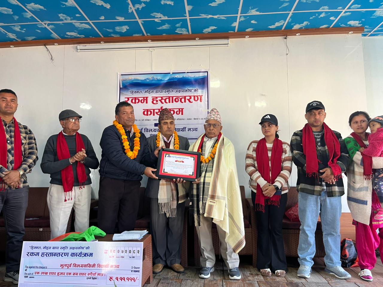 थापाले रु. १ लाख ११ हजार,११ सय ११ को नगद अक्षयकोष भूतपूर्व विन्ध्यवासिनी विद्यार्थी मञ्चका अध्यक्ष हरिबहादुर बरुवाललाई औपचारिक रूपमा आज विन्ध्यवासिनी स्कूलको सभाहलमा गरिएको औपचारिक कार्यक्रममा सो रकम हस्तान्तरण गर्नुभएको थियो।